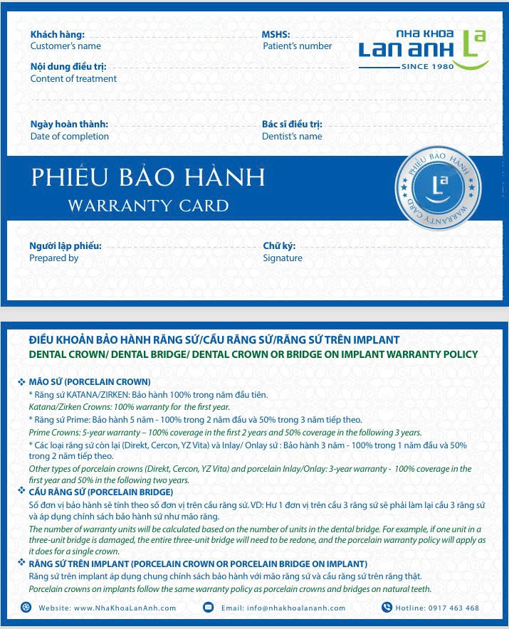 Sau khi điều trị răng sứ cao cấp và implant tại nha khoa Lan Anh, bạn sẽ nhận được một phiếu bảo đảm đầy đủ, chi tiết về loại phục hình, thời gian bảo hành,… đây sẽ là nền tảng cho việc theo dõi, chăm sóc phục hình và khách hàng được chu đáo hơn.